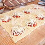 - قطعوا رول العجين إلى مربعات وافردوها سوية.