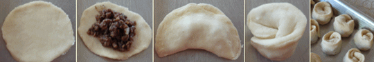 - خذي دوائر العجين وضعي قليلا من الحشوة في وسطها ثم طبقي الأطراف على بعض لتصبح نصف دائرة